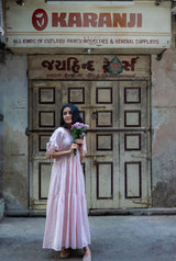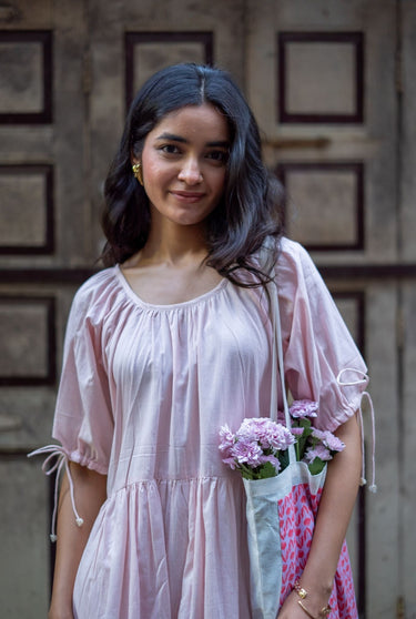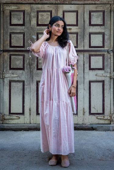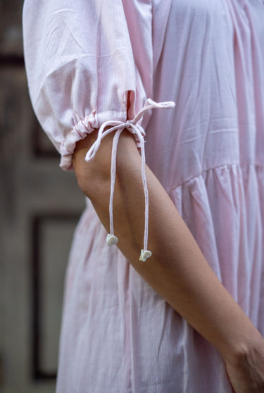 This soft pink maxi is made from handwoven fabric and dyed with natural colors, featuring a tiered silhouette and little bow ties on sleeves. Free-size and easy to wear, an easy fit for your everyday.