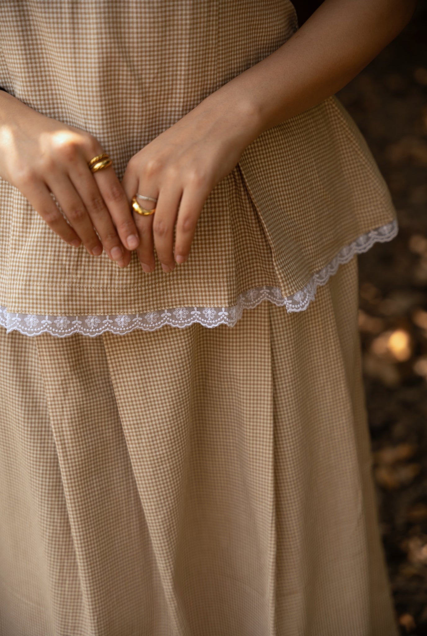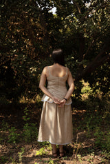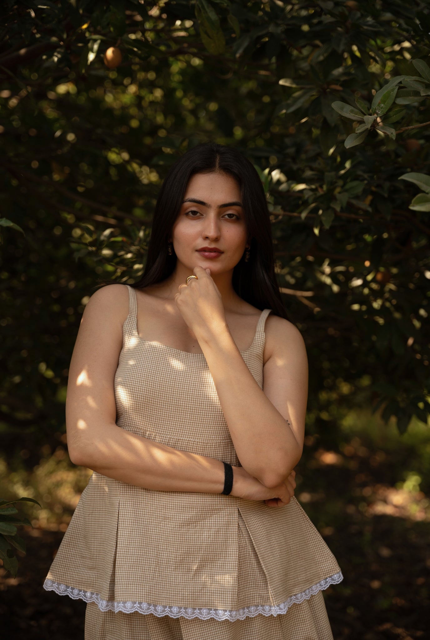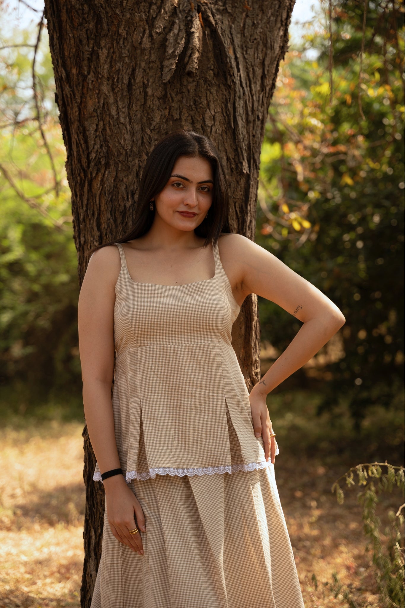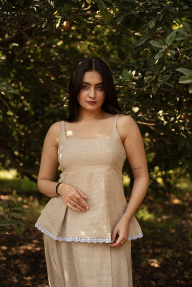A strappy top in handloom cotton with a brown check weave. Designed with box pleats for a flattering, snatched fit and finished with a flirty lace detail at the hem, it has a playful yet easy feel. Style it with the matching skirt or wear it with your everyday favourites.