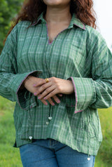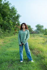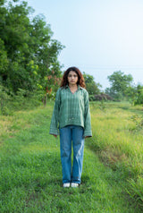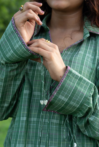 This garment is made from soft handloom cotton, woven in Madhya Pradesh by skilled artisans using age-old techniques passed down through generations. Known for its breathability and gentle texture, this fabric is crafted slowly and mindfully on traditional looms. It carries the quiet charm of handmade processes—subtle irregularities, a natural drape, and a story of craft, care, and culture woven into every thread.