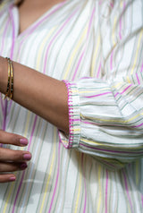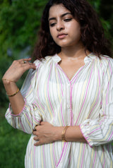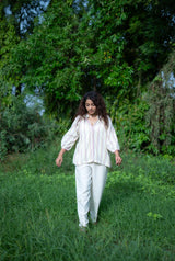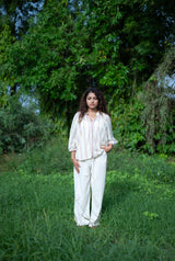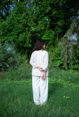 This garment is made from soft handloom cotton, woven in Madhya Pradesh by skilled artisans using age-old techniques passed down through generations. Known for its breathability and gentle texture, this fabric is crafted slowly and mindfully on traditional looms. It carries the quiet charm of handmade processes—subtle irregularities, a natural drape, and a story of craft, care, and culture woven into every thread.