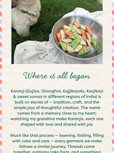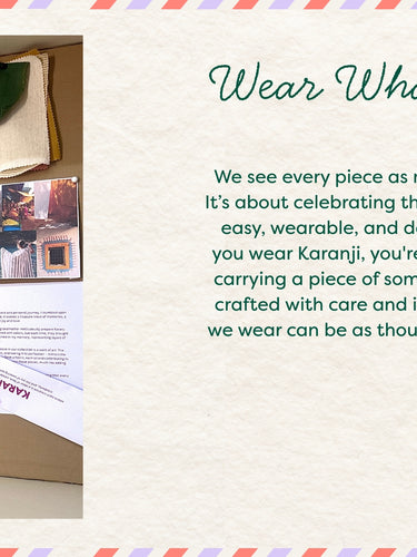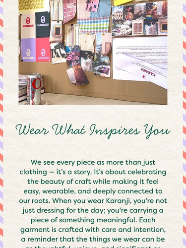 At Karanji, we believe that every stitch tells a story, every design holds a memory, and every piece celebrates the art of thoughtful living — wear what inspires you, live what you love.