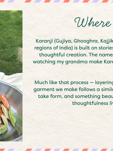 Rooted in a love for Indian textiles, we created Karanji to celebrate craftsmanship through clothing made for real, everyday moments. Our garments are designed with breathable fabrics and relaxed silhouettes that feel good to live in—whether you're out and about or unwinding. Guided by sustainable values, we use natural materials and thoughtful processes to create pieces that care for both the maker and the environment.