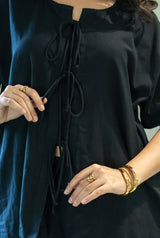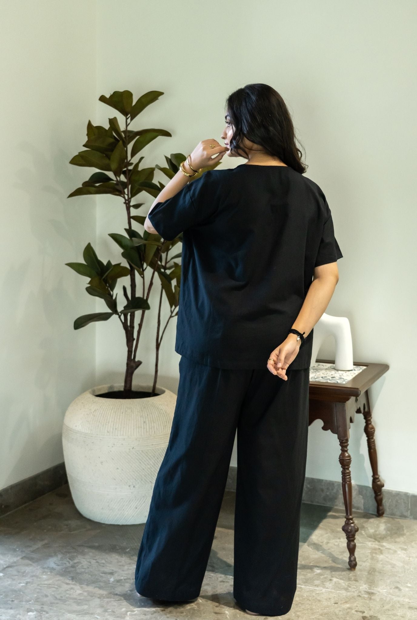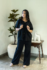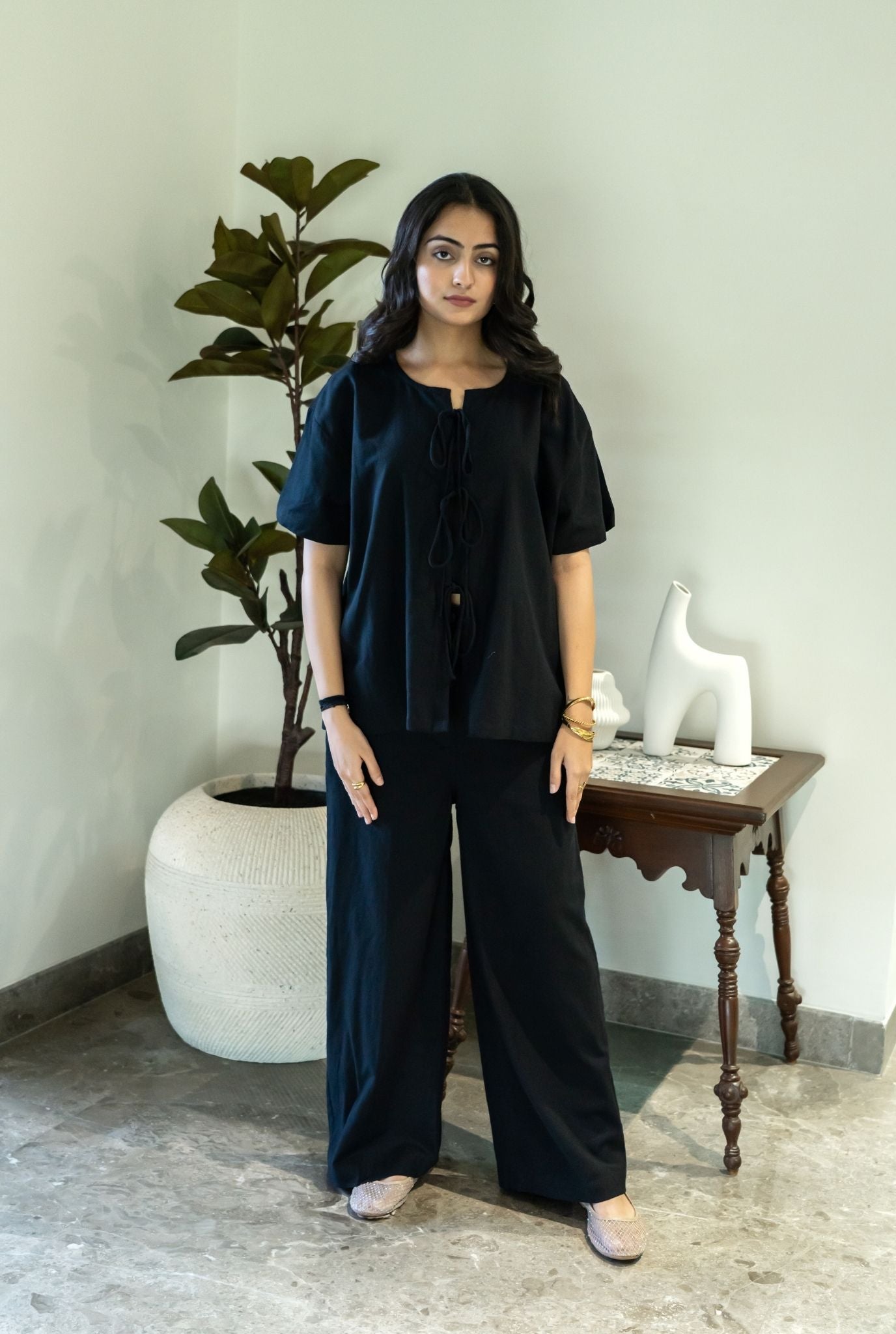 A cotton co-ord that pairs a centre-front tie top with easy pants. The top is cut in a boxy fit with tie details at the front and hidden panels underneath for comfort, giving you the look without feeling too open. The pants ground the set with a buttoned waist, stretchable back, and pockets (always necessary).